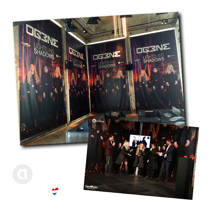 Megagrote Backdrops hebben wij mogen produceren in opdracht van AvroTros. Dit tbv de presentatie van OG3NE in de Amsterdam Tower voor haar nieuwe nummer Lights and Shadows, waarmee zij de finale haalden en uiteindelijk 11e werden op het EuroVisie Songfestival.